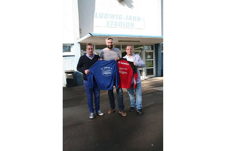 Der Spielort bleibt, die Kleidung ändert sich: Der rote Radewig-Pullover, den Dennis Freudenberg (r.) festhält, hat bald ausgedient. Daniel Bubrowski (l.) und Sven Gleisner präsentieren ein Oberteil, das einst die Spieler der 2. Mannschaft des SC Herford trugen. Unverändert bleibt nur eins: Die jetzigen Radewiger Spieler haben ihre sportliche Heimat auch künftig am Ludwig-Jahn-Stadion.