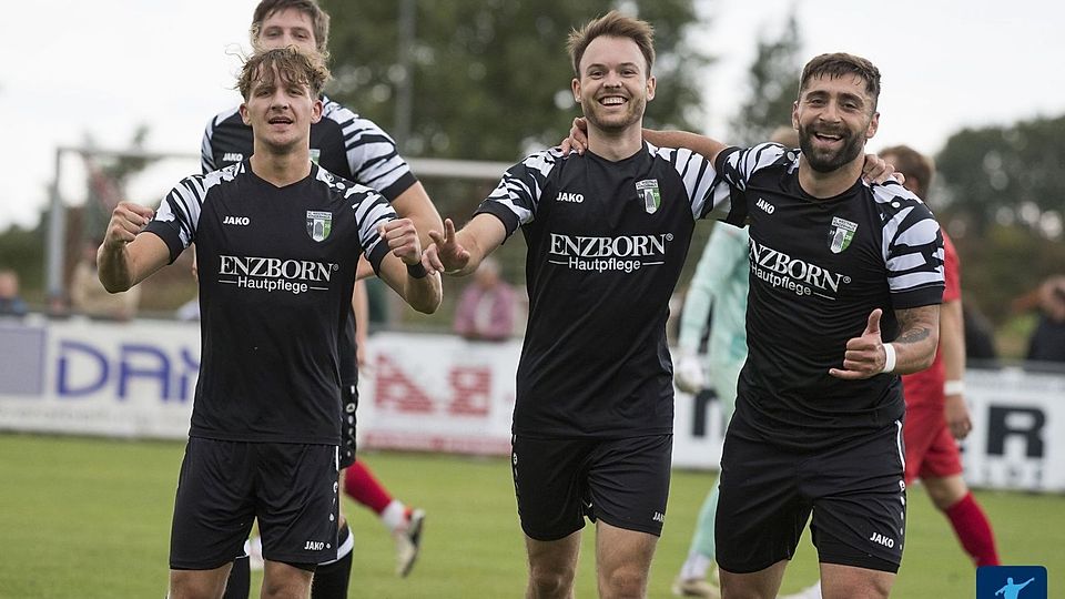 Engin Güney (l.) und Justus Kappel-Sudbrock (r.) bejubeln mit Torschütze Luis Sievers den Treffer zum 1:0.