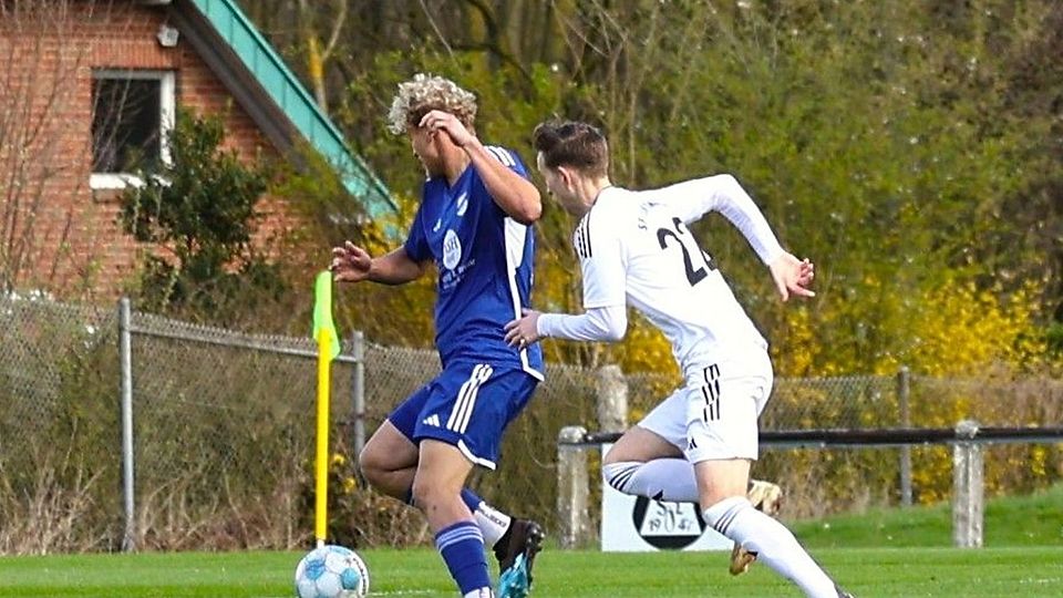 Büscher wird tief in die gegnerische Hälfte geschickt, macht den Ball fest und streichelt den Ball Pohlmann auf den Kopf.