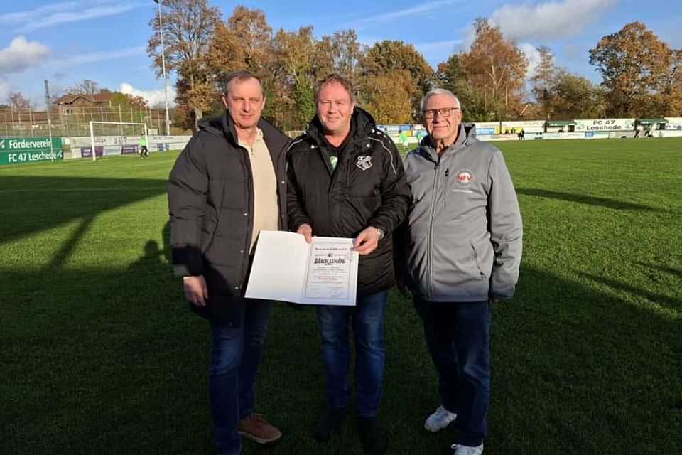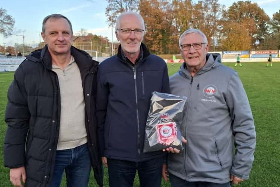 Foto (von links): Manfred Drente, Ehrenamtsbeauftragter des FC Leschede, Werner Kuper,Heinz-Gerd Evers, Vorsitzender des NFV Kreis Emsland
