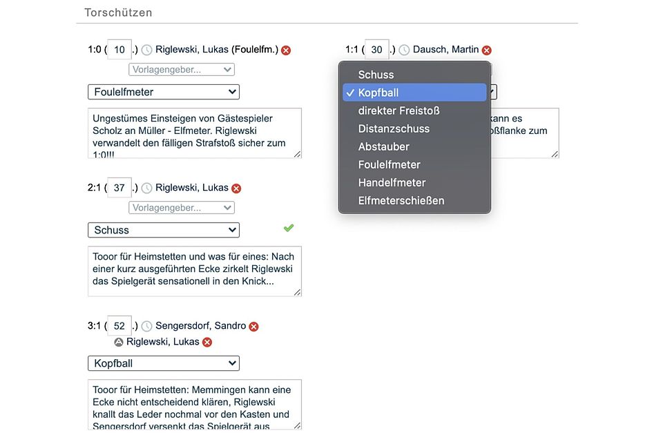 Du kannst jetzt auch Tore im Spielbericht schildern, ohne dass ein Liveticker bedient werden muss.