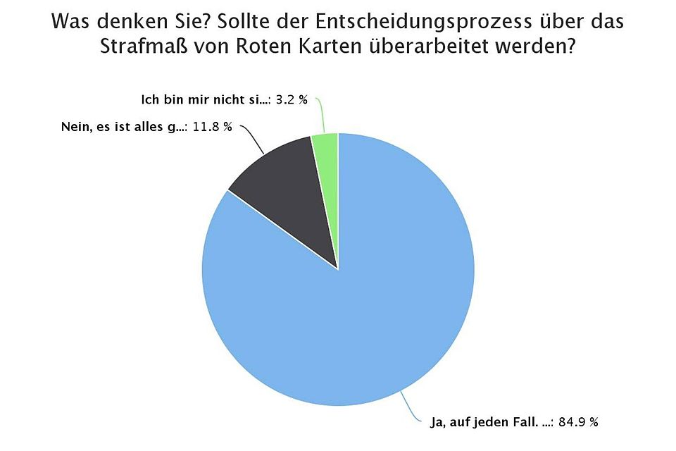 Wir haben ein Voting erstellt. Und ihr habt fleißig abgestimmt. Das Ergebnis gibt eine klare Meinung wieder. 84,9 % (237 Stimmen) möchten, dass der Entscheidungsprozess über das Strafmaß von Roten Karten überarbeit wird, 11,8 % (33) finden den bisherigen Prozess in Ordnung und 3,2 % (9) sind sich nicht sicher.