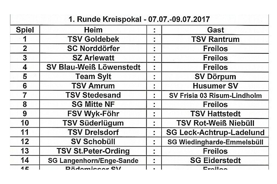 F: PattenDas Ende der Fußball-Sommerpause ist auch im Kreis Nordfriesland bereits wieder in Sicht. Nun wurde die erste Runde im Kreispokal ausgelost. Los geht es am 7. Juli. Aber auch die ersten zwei Achtelfinal-Paarungen stehen bereits fest.