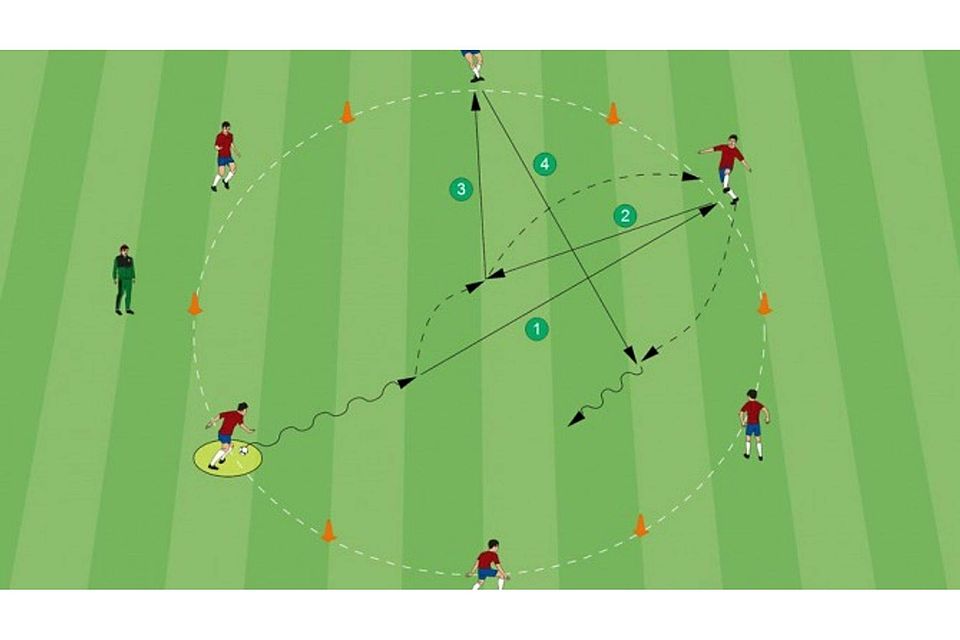Ablauf: Sechs oder mehr Spieler positionieren sich außerhalb des Kreises. Ein Spieler hat einen Ball am Fuß und dribbelt in den Kreis. Er spielt einen beliebigen Mitspieler an (1) und bekommt den Ball direkt zurückgespielt (2). Der Ball wird auf einen dritten Mitspieler weitergeleitet (3) und direkt in den Lauf des zweiten Spielers in den Kreis gespielt (4). Der erste Spieler übernimmt die freie Position.