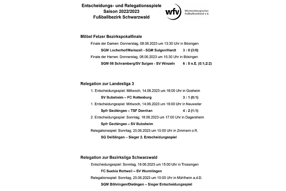 Der Fußballbezirk Schwarzwald teilt das Folgende mit: