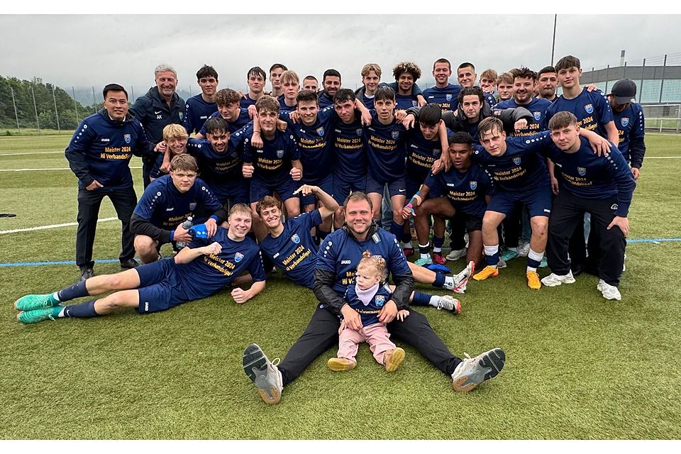 Nach dem Abpfiff: Grenzenloser Jubel der ASC U 19-Helden über den Meistertitel und den Aufstieg. Voller Glücks-Adrenalin streifen sich die Jungs um Kapitän Lennart Günther die blauen Sieger-Shirts über. Trefflicher Aufdruck: "Meisterschaft 2024: Hi Verbandsliga!"