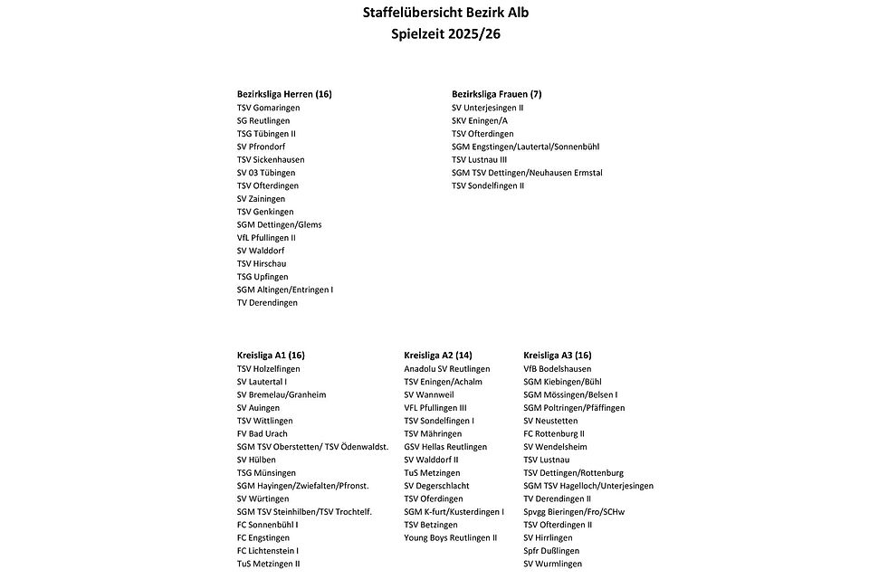 Vom Fußballbezirk Alb kommen neue Infos. Die Pokalpaarungen werden im Rahmen des Bezirksstaffeltags am morgigen Freitag ab 19 Uhr in Hirschau gezogen. Zudem stehen die Staffeleinteilungen fest. Diese sehen wie folgt aus: