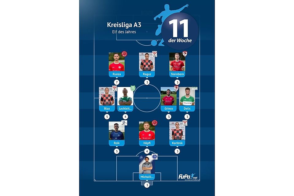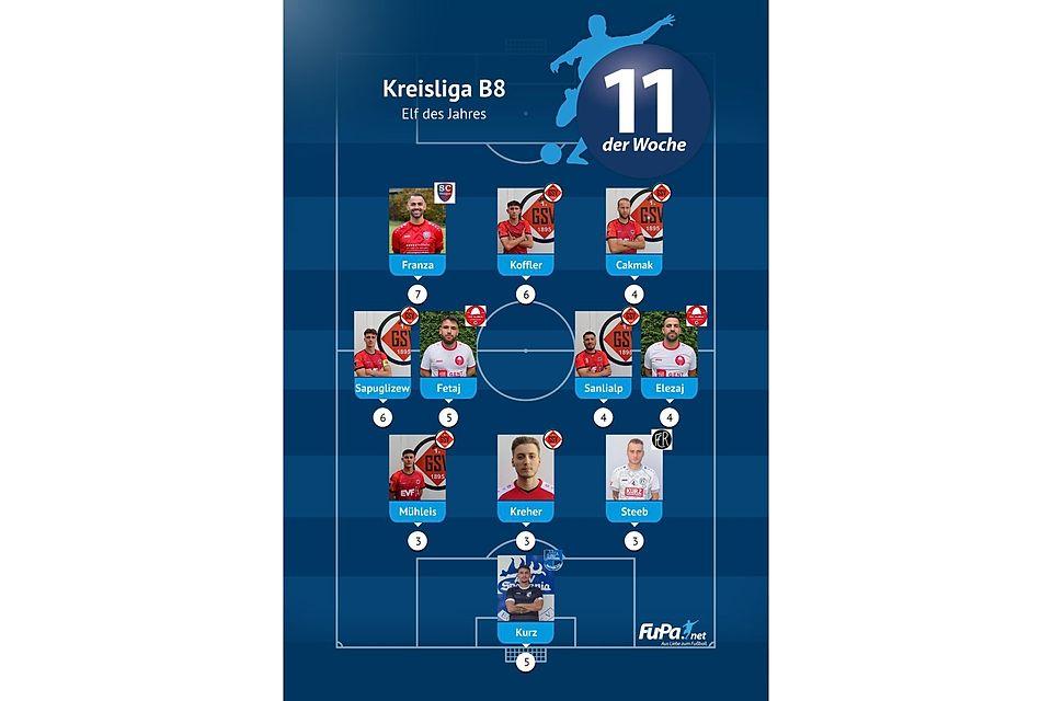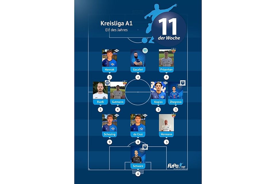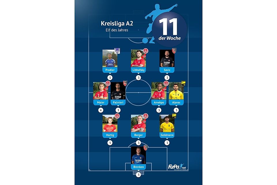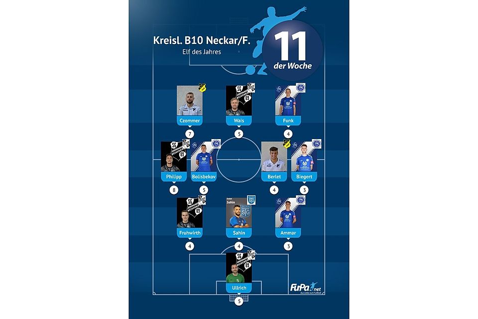 Woche für Woche präsentieren wir quer durch alle Ligen eine FuPa-Elf der Woche – sofern die Voraussetzungen durch eure Mitarbeit erfüllt sind. Dazu gehört vor allem, dass die Mannschaftsaufstellungen eingetragen sowie Tore und Assists eingepflegt wurden. Auch das Abstimmungsergebnis der FuPa-User für die besten Spieler des jeweiligen Teams fließen in die Auswertung ein.