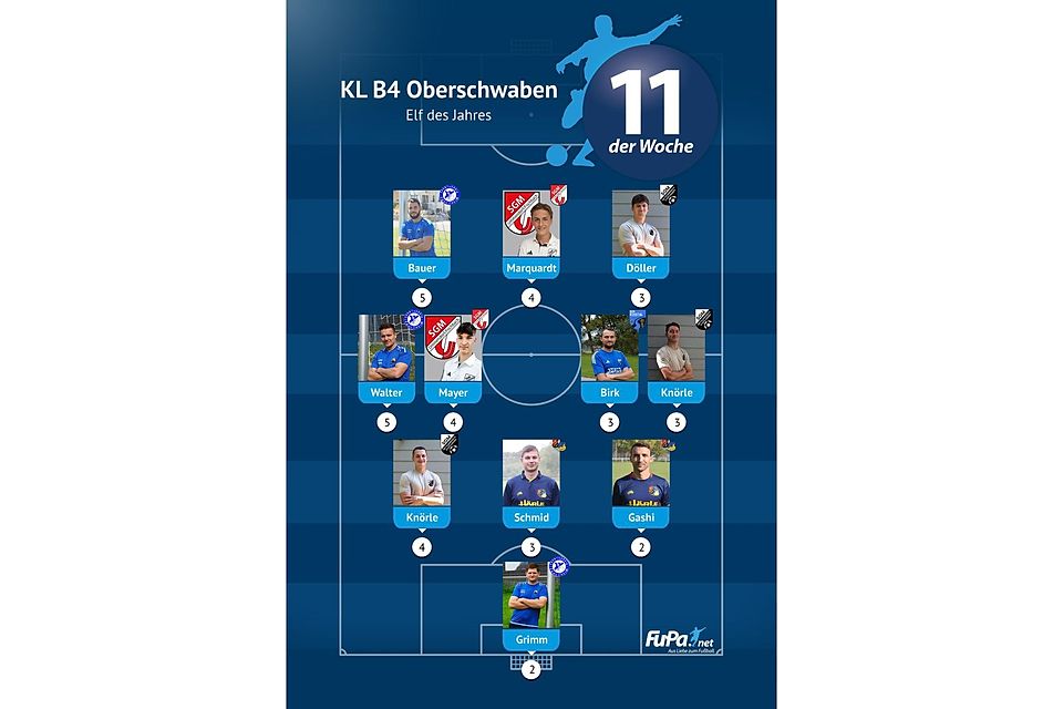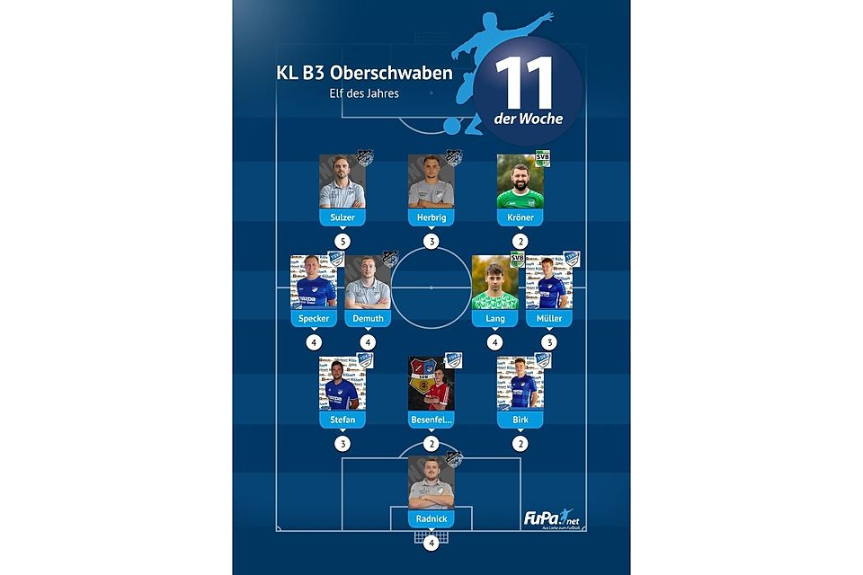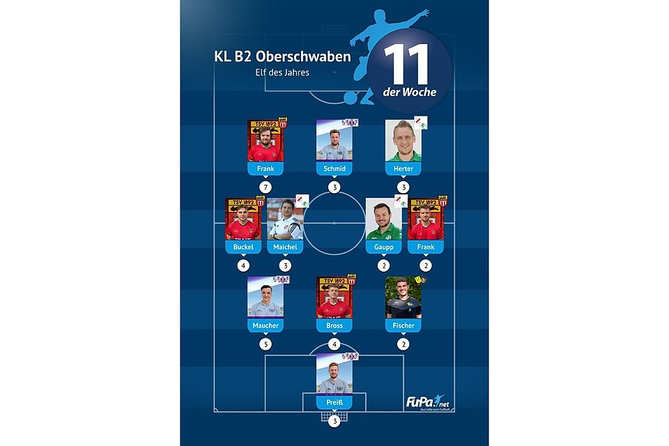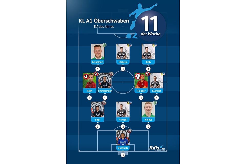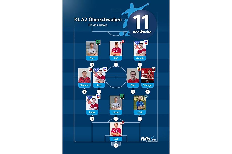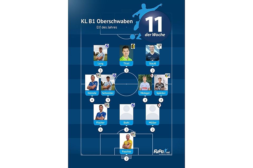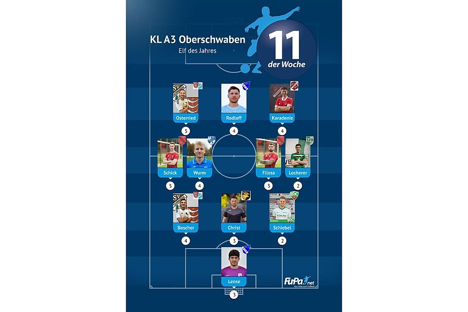 Woche für Woche präsentieren wir quer durch alle Ligen eine FuPa-Elf der Woche – sofern die Voraussetzungen durch eure Mitarbeit erfüllt sind. Dazu gehört vor allem, dass die Mannschaftsaufstellungen eingetragen sowie Tore und Assists eingepflegt wurden. Auch das Abstimmungsergebnis der FuPa-User für die besten Spieler des jeweiligen Teams fließen in die Auswertung ein.