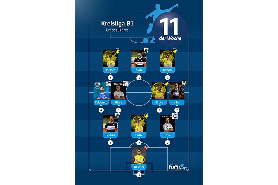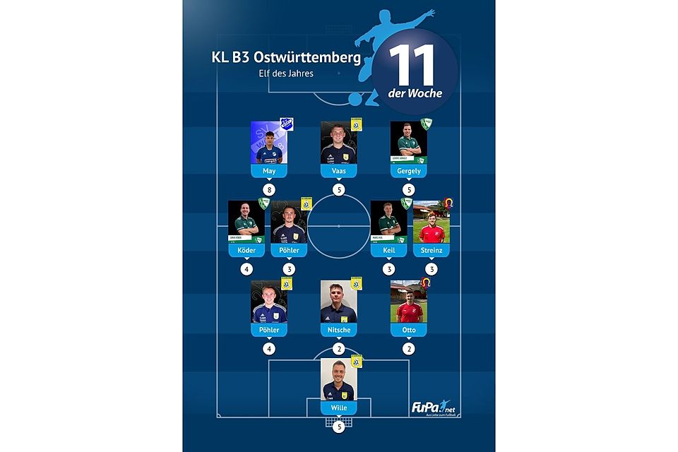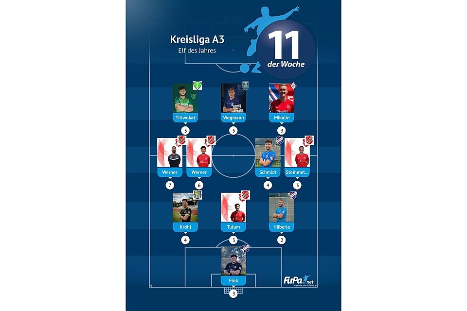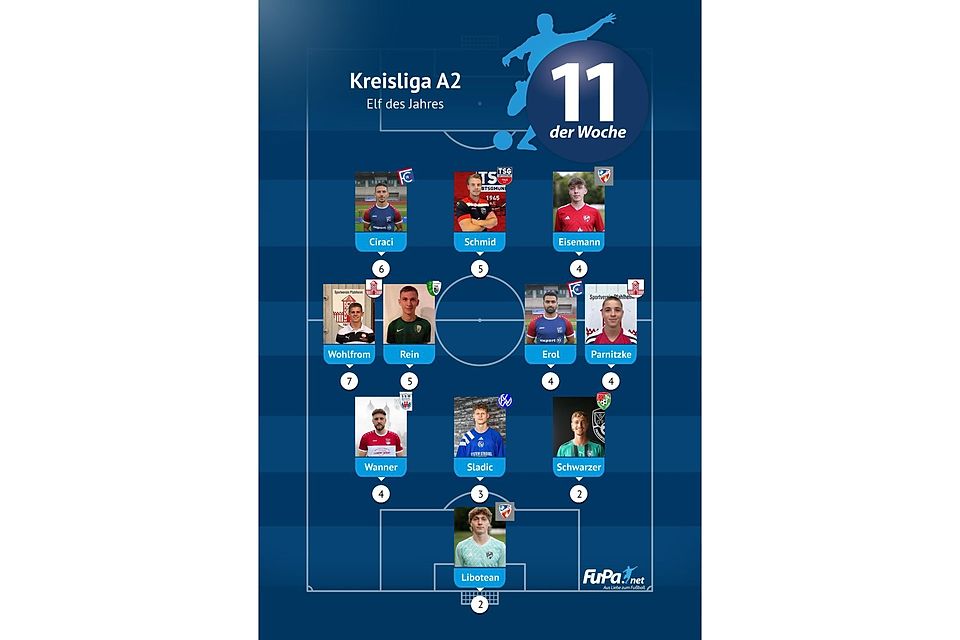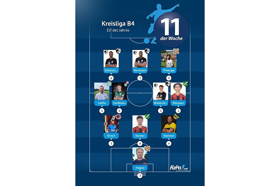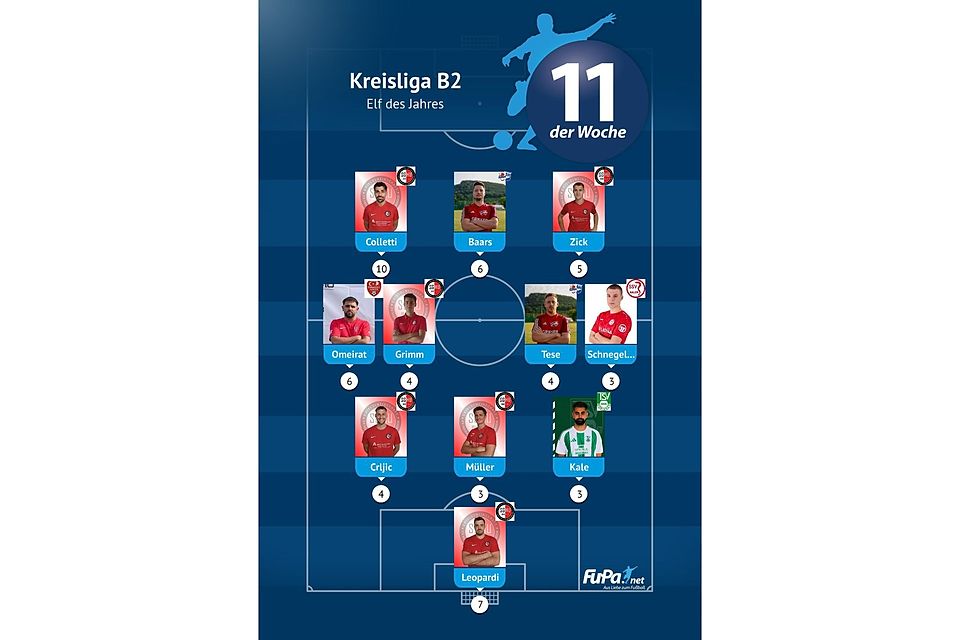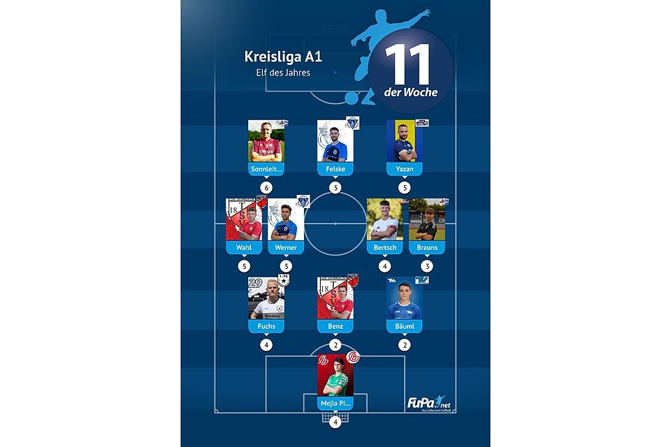 Woche für Woche präsentieren wir quer durch alle Ligen eine FuPa-Elf der Woche – sofern die Voraussetzungen durch eure Mitarbeit erfüllt sind. Dazu gehört vor allem, dass die Mannschaftsaufstellungen eingetragen sowie Tore und Assists eingepflegt wurden. Auch das Abstimmungsergebnis der FuPa-User für die besten Spieler des jeweiligen Teams fließen in die Auswertung ein.