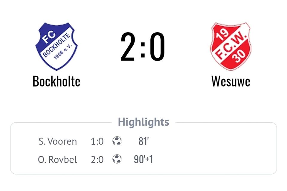 Der FC Bockholte hat sein Heimspiel gegen den FC Wesuwe mit 2:0 (0:0) gewonnen. Lange tat sich die Elf schwer, ehe Simon Vooren per Kopfball nach einer Ecke in der 81. Minute den Bann brach. In der Nachspielzeit stellte Oleg Rovbel den Endstand her, wenn auch aus deutlich abseitsverdächtiger Position.