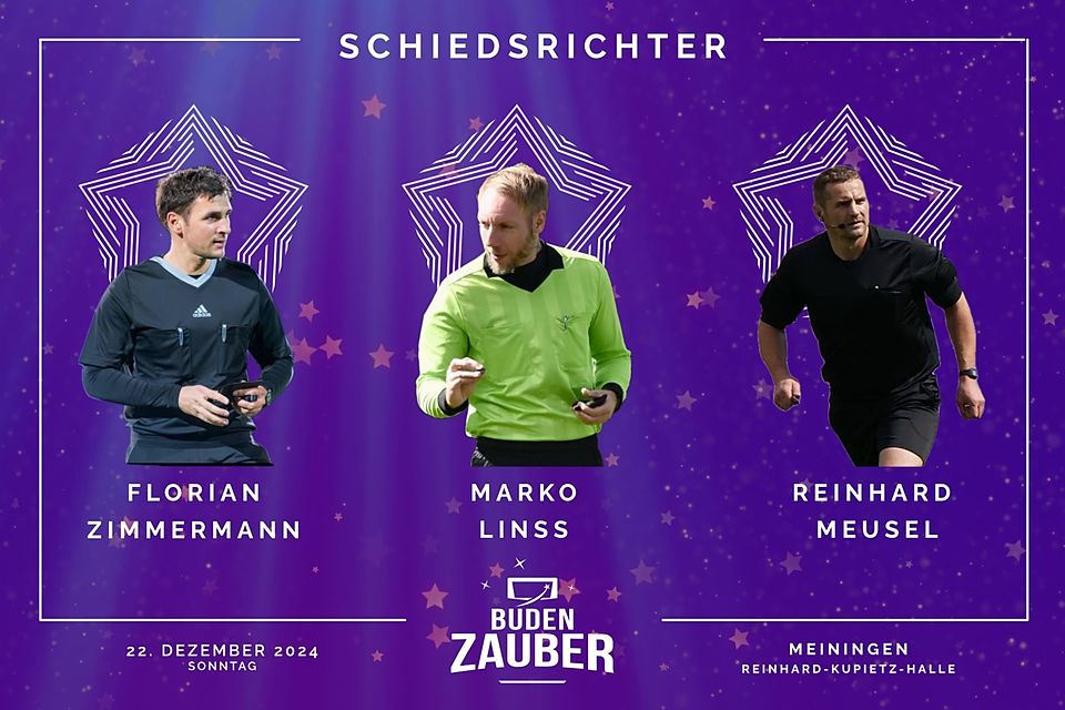 Auch die Schiedsrichter des Budenzaubers stehen bereits fest. Dabei konnten mit Florian Zimmermann (Reundorf), Marko Linß (Neustadt) und Reinhard Meusel (Neuhaus-Schierschnitz) drei kommunikative Unparteiische gewonnen werden. Für Linß und Meusel ist es die zweite Teilnahme als Schiedsrichter beim Budenzauber. Für Florian Zimmermann ist es hingegen eine besondere Reise in die eigene Vergangenheit. Denn der 41-Jährige spielte einst selber Fußball in Henneberg. Mittlerweile pfeift er in der Schiedsrichtergruppe Steigerwald (Franken) in der bayrischen Landesklasse.