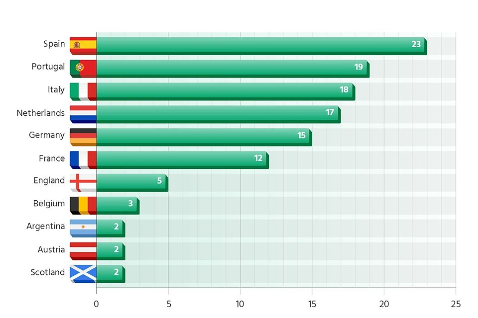 Spitzenreiter: Spanien dominiert das Ranking mit insgesamt 23 Managern, gefolgt von Portugal (19) und Italien (18).