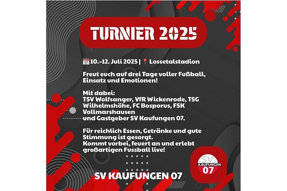 Der SV Kaufungen 07 lädt vom 10. bis 12. Juli 2025 zum großen Heimturnier ins Lossetalstadion. Fans und Fußballfreunde dürfen sich auf drei intensive Tage mit spannenden Duellen, regionalem Fußball und bester Stimmung freuen.