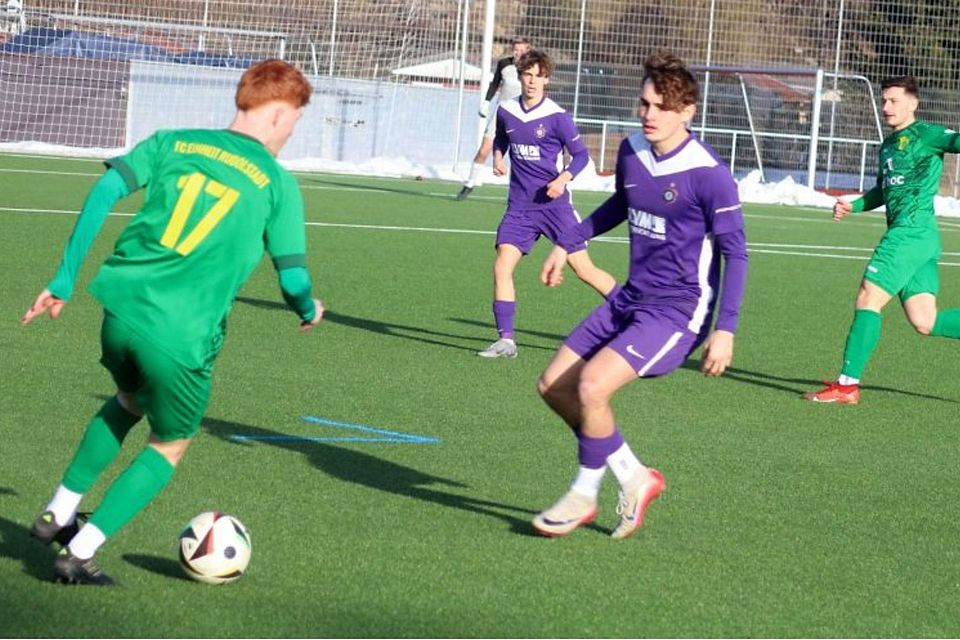 Zu Beginn der zweiten Halbzeit nutzten beide Trainer Gelegenheiten, um Spieler zu wechseln und frische Impulse zu setzen. Beim Gast sah die Bank allerdings dünn aus – nur vier Wechselspieler standen bereit. Zudem fehlten Manfred Starke, Toni Jörg Stelzer, Marco Riemer und Liam Floßmann aus unterschiedlichen Gründen. Der zweite Durchgang startete mit einer Rettungstat von Paul Schneider auf der Linie (47.). Aue wurde stärker, ließ aber, sehr zum Ärger von Trainer Philip Hauck, zahlreiche Möglichkeiten liegen. Rudolstadt hatte reichlich zu tun, um Gegentreffer zu verhindern, wobei die jungen Gastgeber fahrlässig mit ihren Chancen umgingen. Auch Kunth zeigte sich wie Bresemann im Kasten vor der Pause stets auf der Höhe. Das 2:1 für die Einheit fiel schließlich nach einer gelungenen Kombination über die Stationen Marvan Kponton, Sven Rupprecht, Max Schlegel und schließlich Ole Barthel, der freigespielt mühelos einschob (70.). Zwar versuchten die jungen Hausherren danach, das Blatt noch zu wenden, doch ein Fehler ihres Keepers bescherte Aue in der 85. Minute durch Robin Ensenbach sogar das dritte Gegentor.