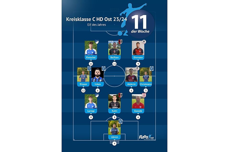 Die FuPa Elfen der Saison in den Heidelberger Ligen (Kreisliga, Kreisklasse A, Kreisklasse B, Kreisklasse C West und Kreisklasse C Ost) setzen sich folgendermaßen zusammen.