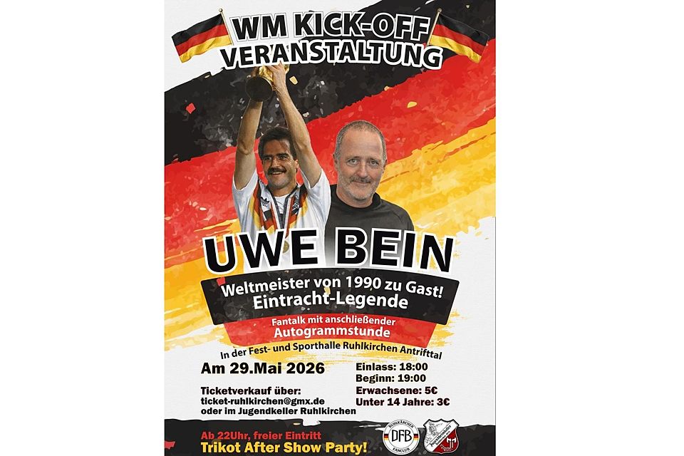 In den vergangenen Monaten reifte deshalb die Idee, zur bevorstehenden Weltmeisterschaft einen „WM-Kick-off“ in Ruhlkirchen auszurichten. Höhepunkt des Abends wird ein Fantalk mit Uwe Bein sein. Der Weltmeister von 1990 zeigte sich von dem Konzept sofort angetan und plant den Abend gemeinsam mit den Organisatoren. Bein will aus seiner Karriere berichten, über besondere Momente im Nationaltrikot sprechen und auch Einblicke hinter die Kulissen geben. Im Anschluss soll zudem Zeit für Fragen, Autogramme und Fotos bleiben. Ausklingen kann der Abend bei einer Trikot-Party, während sich der Jugendkeller um die Bewirtung kümmert.