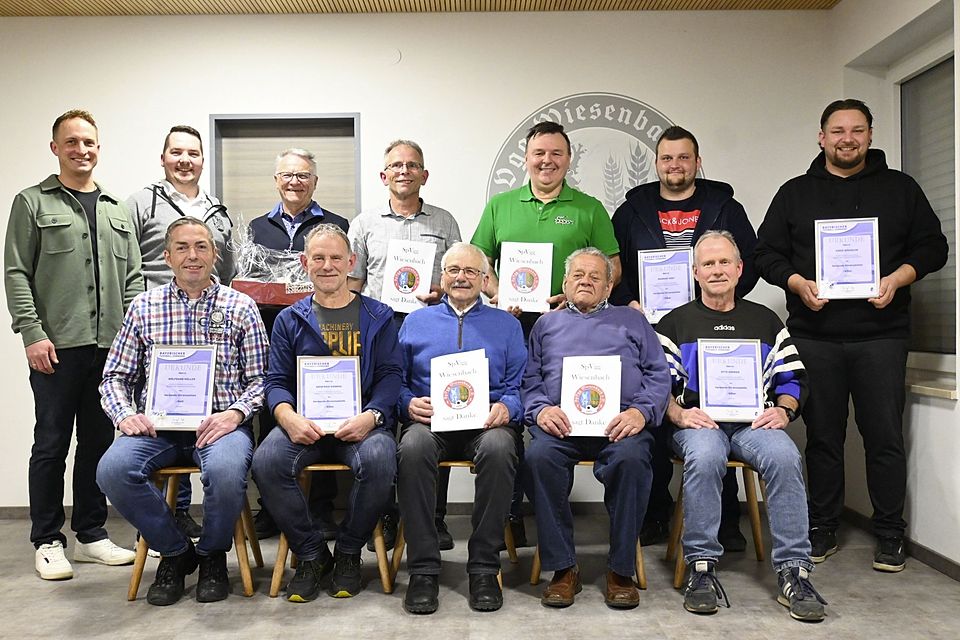 Als kleines Zeichen der Wertschätzung für ihre langjährige Vereinstreue bedankte sich Vereinsehrenamtsbeauftragter Max Thurn bei Alfred Mayer (70 Jahre), Werner Negele (60 Jahre), Harald Fent, Markus Katzer, Max Thurn (50 Jahre) und Manfred Dreher (40 Jahre) mit der Urkunde „SpVgg Wiesenbach sagt Danke“.