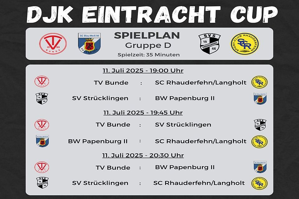 Aus der Gruppe D wollen der Sieger des letzten Eintracht-Cups im Jahr 2023, TV Bunde (Bezirksliga, Trainer Frank Winkler), BW Papenburg II (Kreisliga Emsland, Trainer Thorsten Plate), SV Strücklingen (1. Kreisklasse, Trainer Björn Bullermann und Dennis Widder) und SC Rhauderfehn Langholt (Ostfrieslandklasse A, Trainer Gerd Bartsch & Gerd Stubbe) das Finale erreichen.