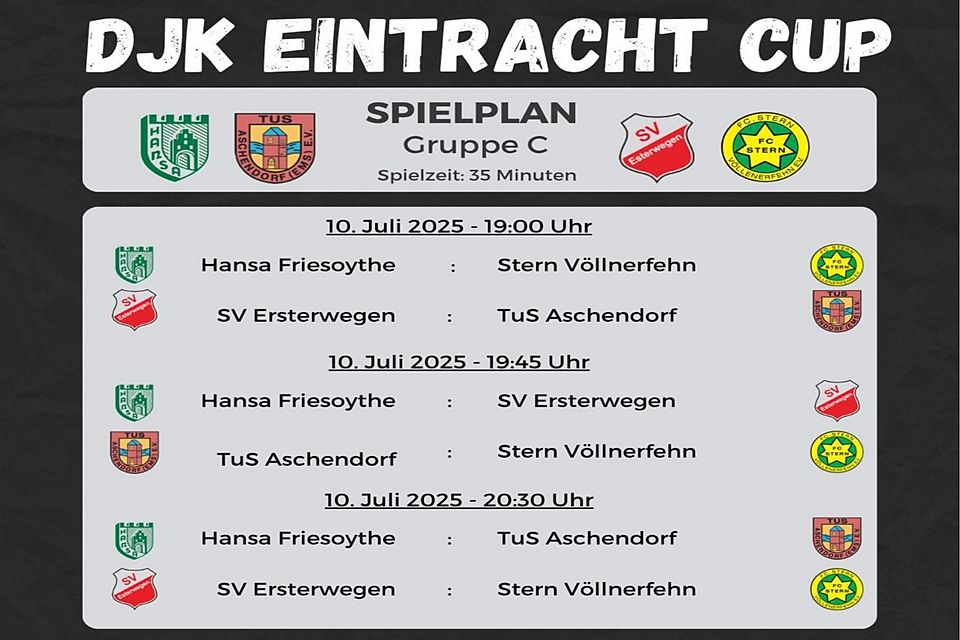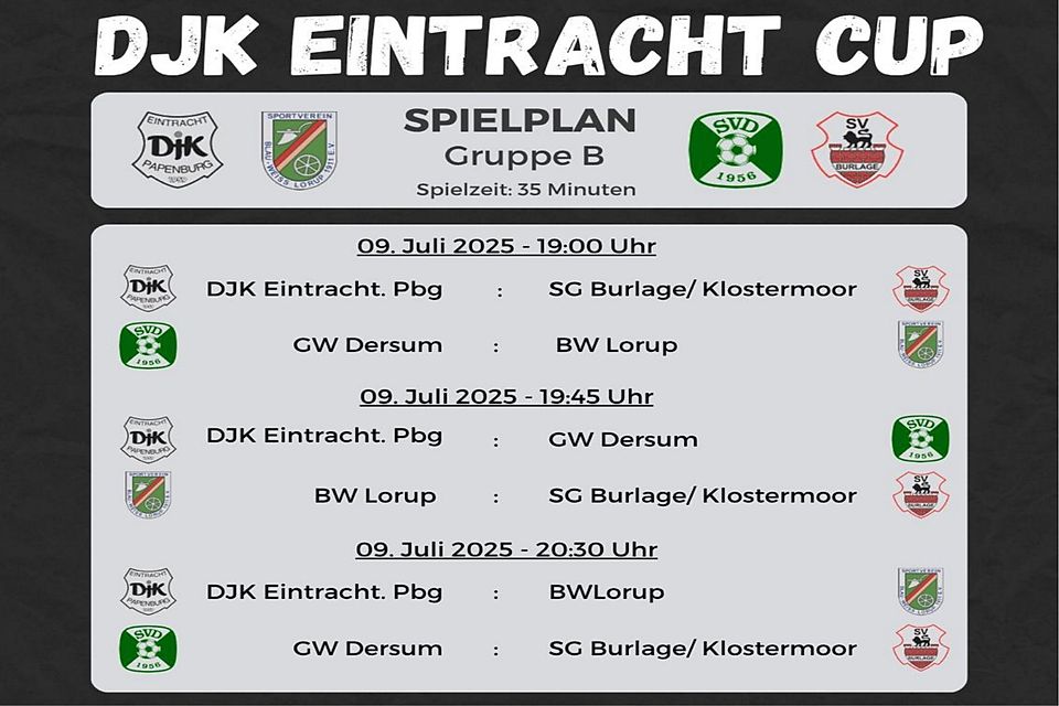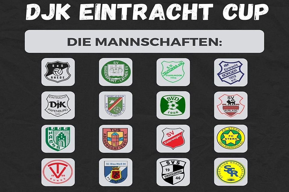 Mit einem stattlichen Aufgebot an erfahrenen Fußballmannschaften aus dem Ligabetrieb startet der diesjährige Wettbewerb um den DJK Eintracht Cup in Papenburg. 16 Fußballteams von der 1. Kreisklasse und die Kreisliga über die Ostfriesland-Klassen A und B bis hin zur Bezirksliga treffen vom 8. bis 13. Juli in der Sommervorbereitung auf dem Sportplatz am Splitting links aufeinander.