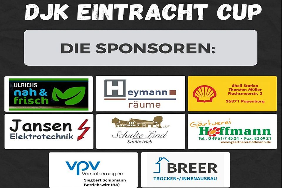 Zu den Sponsoren, die das Turnier dank ihrer großartigen finanziellen Unterstützung erst möglich machen, gehören die Papenburger Unternehmen Trocken- und Innenausbau Breer, Shell-Station Thorsten Müller, Saalbetrieb Schulte-Lind, Heymann-Räume, VPV Versicherungen Siegbert Schipmann, Markant-Markt Ullrichs, Gärtnerei Hoffmann und Elektrotrechnik Jansen. (ta)