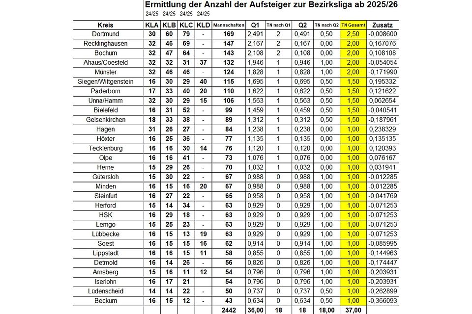 Dortmund bleibt mit Abstand der größte Fußball-Kreis (169), Beckum beherbergt nur noch 43 Mannschaften. Im Großen und Ganzen gibt es nur geringfügige Verschiebungen, so dass es bei der nächstjährigen Aufstiegsregelung zur Bezirksliga (Saison 2025/26) keine Veränderung geben dürfte. Noch wenige mögliche Rückzüge im Saisonendspurt dürften keinen Einfluss mehr nehmen.