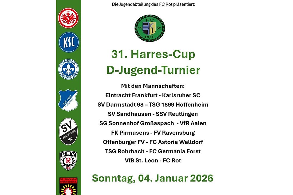Neben den lokalen Größen wie dem SV Sandhausen und dem FC Astoria Walldorf, sind auch wieder einige Hochkaräter mit von der Partie. Der Rekordsieger Karlsruher SC hat direkt um 9:30 Uhr das Auftaktspiel und versucht den 7. Turniersieg zu holen. Mit 1899 Hoffenheim und der Eintracht Frankfurt sind zwei Bundesligavereine am Start, die mit Sicherheit etwas dagegen haben werden. Doch auch viele weitere starke Vereine wie Darmstadt 98, Sonnenhof Großaspach, Reutlingen und Aalen sind dabei. Der Offenburger FV konnte bereits zwei Mal den Harres-Cup gewinnen und ist immer ein heißer Geheimtipp. Herzlich begrüßen wir auch den FK Pirmasens und den FV Ravensburg zum 31. Harres-Cup.