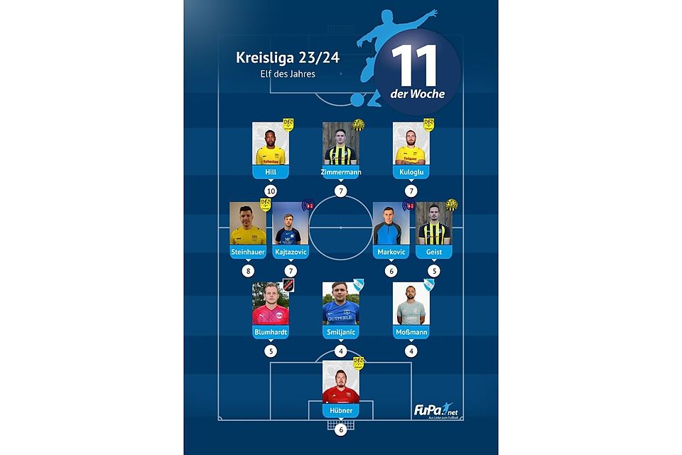Die FuPa Elf der Saison in der Kreisliga Mannheim setzt sich aus folgenden Akteuren zusammen (in Klammern immer die Anzahl der Nominierungen für die FuPa Elf der Woche):