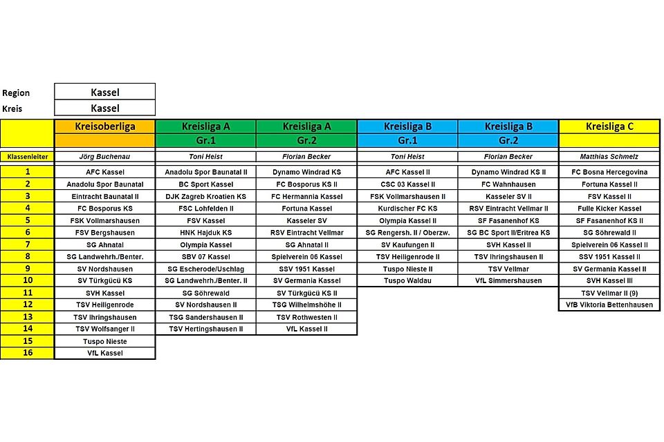Die Kreisoberliga erwartet neu die drei Gruppenliga-Absteiger TSV Heiligenrode, FSK Vollmarshausen und SV Türkgücü Kassel sowie aus der Kreisliga A die vier Aufsteiger Eintracht Baunatal II, TSV Ihringshausen, FSV Bergshausen und TSV Wolfsanger II.