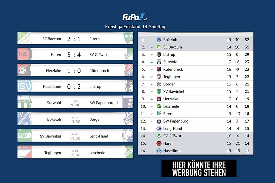 Herzlake feiert damit den vierten Sieg in Folge und untermauert seine starke Form. Für den SV Listrup hingegen war es erneut ein bitterer Abend gegen den VfL, fast eine Kopie des 1:5 aus der Vorwoche.