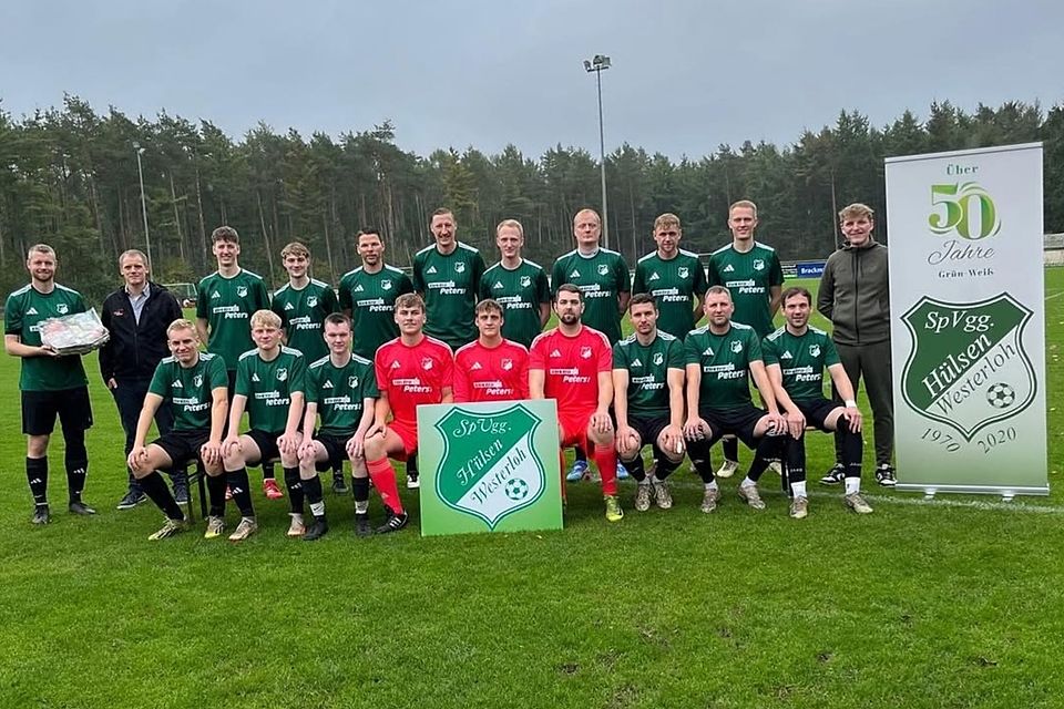 Frisch aus dem Karton, direkt auf den Platz: Die 1. Herren der SpVgg Hülsen/Westerloh laufen ab sofort im neuen Zwirn auf. Möglich gemacht hat das Elektro Peters aus Haselünne, die nicht nur mit Strom, sondern offenbar auch mit Stil richtig gut umgehen können.