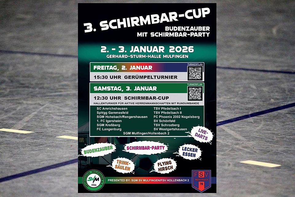 Der Schirmbar-Cup am heutigen Samstag entwickelte sich in der Gerhard-Sturm-Halle in Mulfingen zu einem intensiven und vielschichtigen Hallenturnier. In drei Vorrundengruppen, mehreren K.-o.-Runden und zahlreichen Platzierungsspielen zeigte sich der Hallenfußball in all seinen Facetten. Am Ende setzte sich die SGM Mulfingen/Hollenbach durch und gewann das Turnier nach einem engen Finale gegen den TSV Pfedelbach.