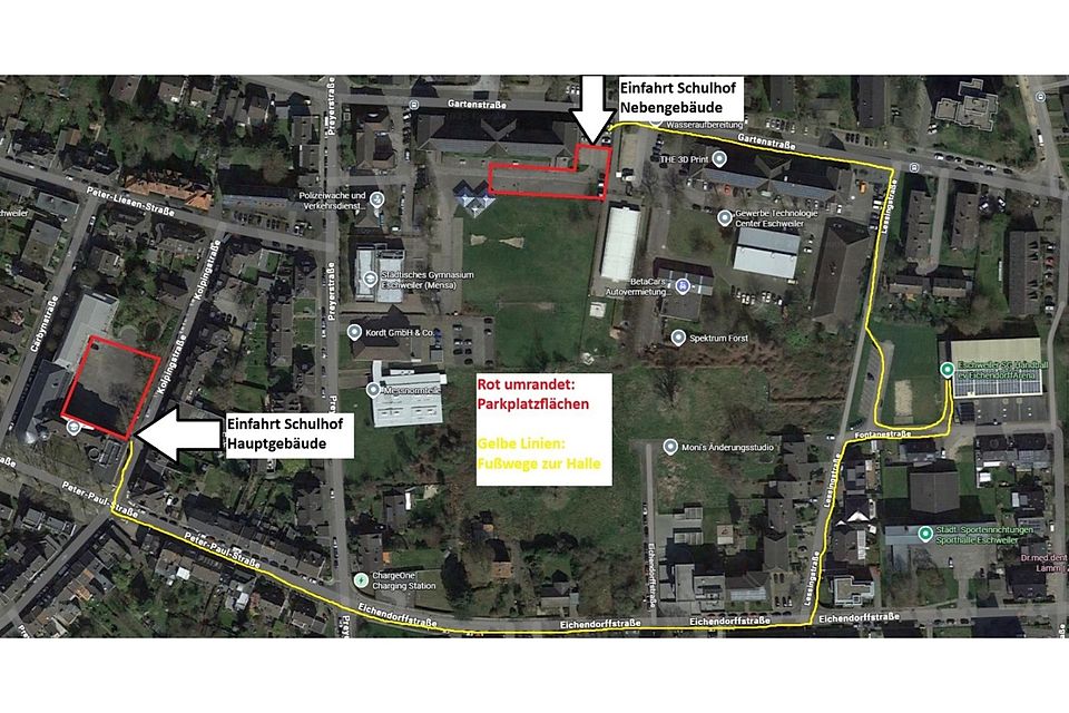 Es wurden deshalb zwei Sonderparkplätze eingerichtet: Der Schulhof des Nebengebäudes des Städtischen Gymnasiums (Zufahrt über Gartenstraße, gegenüber Hausnummer 87) und der Schulhof des Hauptgebäudes des Städtischen Gymnasiums (Zufahrt über Kolpingstraße, gegenüber Hausnummer 30). Von beiden Parkplätzen aus ist die Halle nach wenigen Minuten Fußweg erreichbar. Vom Nebengebäude aus gehen Sie entlang der Gartenstraße und dann rechts in die Fußgängergasse Lessingstraße. Vom Hauptgebäude aus gehen Sie entlang der Eichendorffstraße und dann links in die Lessingstraße.