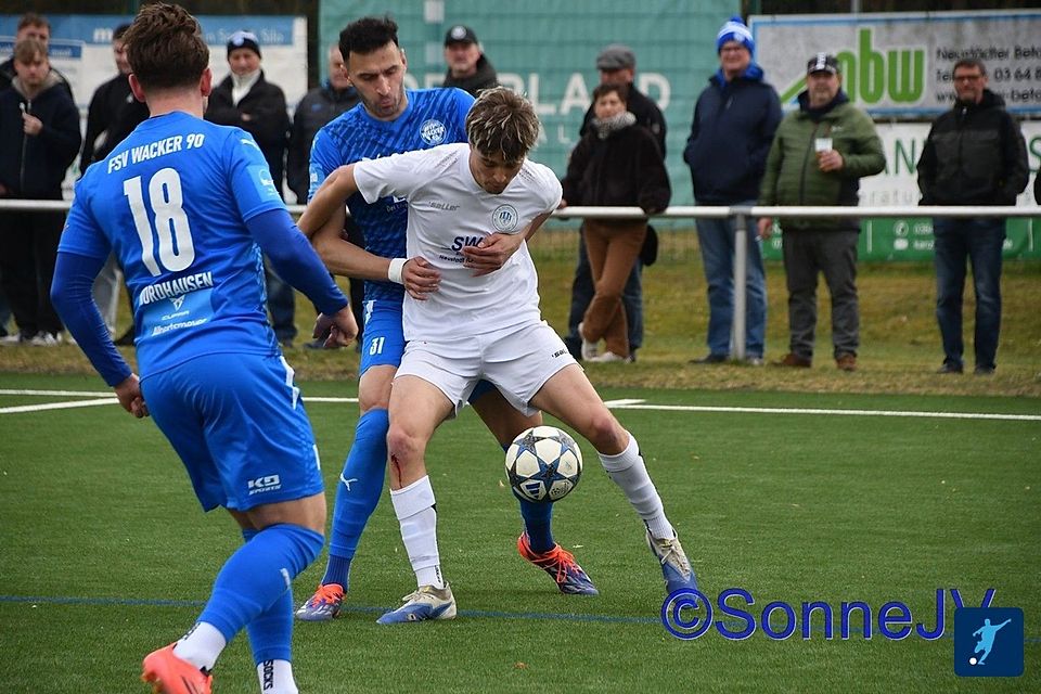 Die erste gute Möglichkeit der Partie hatten dann die Hausherren. Nach 90 Sekunden bricht Bernhard Grimm auf der rechten Seite durch und flankt ins Zentrum, wo Robin Lee Engler erst knapp vorbei rutscht und am zweiten Pfosten Josia Walther dann zu überrascht ist, den Ball zu verwerten. Im Gegenzug haben die Nordhäuser ihrerseits die Riesenchance in Führung zu gehen, als Schlesier am 2. Pfosten völlig freistehend den Ball über die Querlatte köpft (3.). Auch Ludwig fehlt bei seinem Abschluss nur eine Minute später das Schussglück, als sein Versuch von der rechten Seite nur knapp über den Querbalken pfeift (4.). Die Blau-Weißen kamen jetzt besser ins Spiel. Josia Walther wird von Felix Künzel geschickt, sein Versuch kann aber Nordhausens Keeper mit Fussabwehr entschärfen, der zurückspringende Ball fällt erneut Felix Künzel vor die Füße. Sein Abschluss kann Biai gerade noch vor dem Einschlag zur Ecke ablenken (9.). Kurz darauf dann aber doch die Gästeführung. Ein weiter Einwurf wird zu kurz abgewehrt, der Ball kommt zu Stix, der im zweiten Versuch abzieht und sein Schuss durch die Abwehr durchrauscht und im langen Eck einschlägt (0:1, 13.). Blau-Weiss antwortet mit einem Eckball auf den Kopf von Theodor Mohorn, dessen Versuch knapp über den Querbalken streicht (18.). Das Spiel verflachte jetzt und klare Möglichkeiten blieben Mangelware. Nordhausen zog sich zurück und versuchte die knappe Führung abzusichern, was ihnen auch ganz gut gelang. Nordhausen Kapitän Schwerdt versucht es mit einem Chipball von der Strafraumgrenze, der knapp am rechten Pfosten vorbei geht (32.). Die letzte Möglichkeit vor dem Pausenpfiff hatten die Gäste, als Abwehrmann Alex Michallik den Ball im Strafraum abblocken kann (44.).