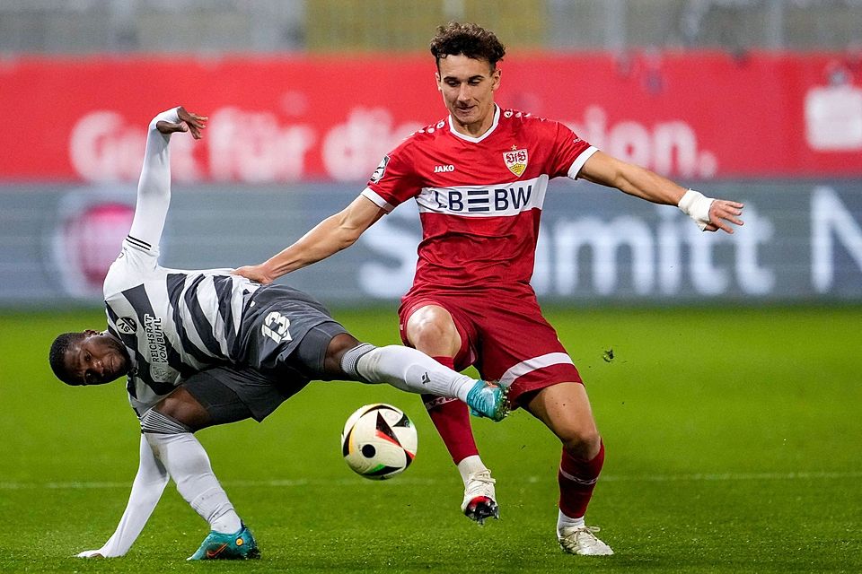7. Minute: Der VfB spielt sich über rechts nach vorne, über Thomas Kastanaras, Leo Münst und Samuele Di Benedetto kommt der Ball dann zum mit aufgerückten Michael Glück, der aus 20 Metern draufhält und die Kugel in die linke Ecke zimmert.