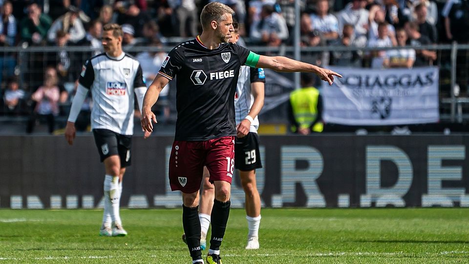 Simon Scherder (Preußen Münster) erhebt sich in der Nähe des Elfmeterpunkts, um einen Freistoß von Marc Lorenz zu verwerten. Mit einem kraftvollen Kopfball bringt er den Ball ins Netz, nachdem dieser vom rechten Pfosten abprallt.