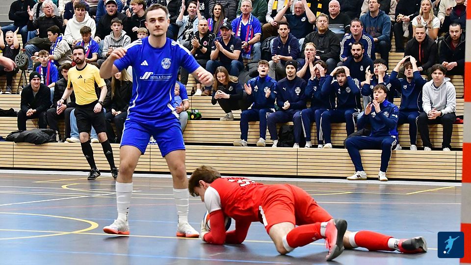 Alexander Weber (rechts) holte sich mit Neugablonz durch den 2:1-Endspielsieg gegen Cosmos Aystetten (links Philipp Toth) den schwäbischen Futsal-Titel 2025. Beide Teams treffen bei der Neuauflage gleich in der Gruppenphase aufeinander.