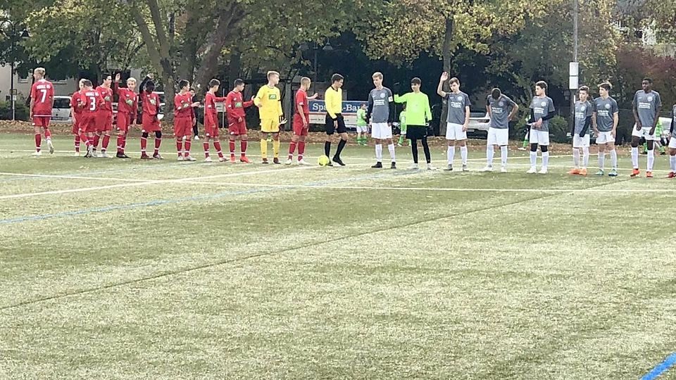 Moritz Hänel von den B-Junioren des TV 1817 Mainz (Mitte) versucht, seinem Gegenspieler vom 1. FC Kaiserslautern II den Ball abzuknöpfen. Es half nichts, die Mainzer verloren 1:3.	 Foto: Sven-Michael Giese
